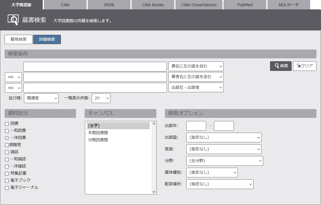 ローカルデータベース (学内所蔵) 検索の詳細検索について説明します。